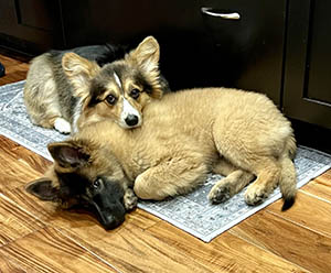 Essie was Nancy's much-debated pick of puppies to take home to daddy Keen and housemate Pip the corgi. She has continued her outgoing sweetness and love of all people and dogs. Essie & Pip have become fast friends,with lots of other friends yet to meet! Herding is a natural activity for Essie, and she started her competitive career in summer '24, earning her PT on October 5. |